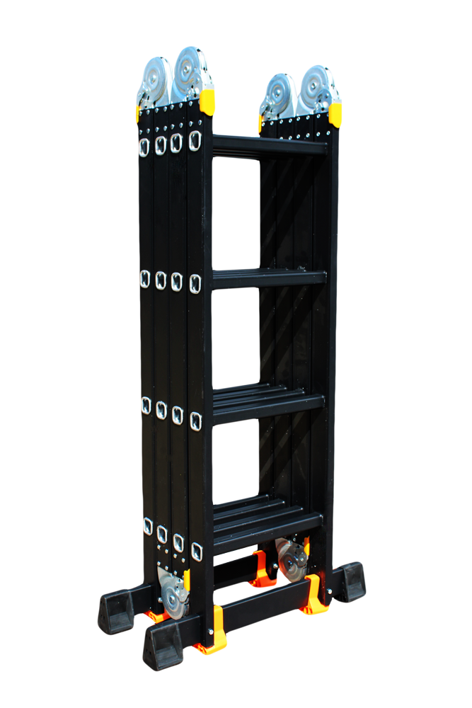 GTM KMP404A - легка драбина-трансформер підвищеної міцності, яка призначається для постійного промислового і побутового використання. Профіль виготовлений з авіаційного алюмінію, має змінну товщину стінки і додатково посилений ребрами жорсткості. Для додаткової стійкості до пошкоджень корпус пофарбований в чорний колір методом електрофорезу. Міцні шарніри і замки надійно фіксують сходи в будь-який з обраних форм. Завдяки такій конструкції трансформер GTM KMP404A здатний витримати без деформації навантаження в 150 кг.